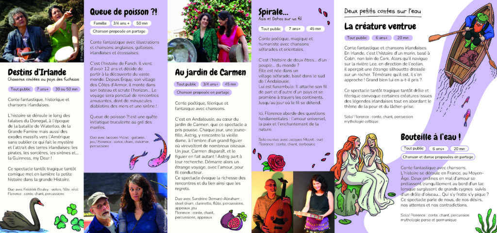 Après avoir chanté dans des groupes de musique d’inspiration world -pop et interprété des pièces des répertoires classique et renaissance pendant une dizaine d’années, j’ai eu envie de raconter des histoires construites autour de chansons, de ma composition ou traditionnelles. Comme j’ai grandi face à l’océan et aux îles anglo-saxonnes que j’ai beaucoup visitées, quelques-uns de mes contes sont inspirés du monde celte. D’autres se tournent vers les terres chaudes et ensoleillées de l’Andalousie, aux portes de la Méditerranée et du Maghreb, autre source d’inspiration. L’océan, c’est l’infiniment grand, le voyage, l’exil, l’inconnu, l’appréhension, les rencontres, l’amour. » Florence